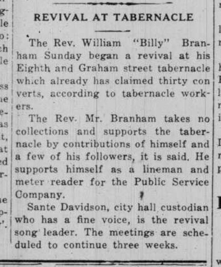 [10] Revival at Tabernacle. 1935, Oct, 2. Jeffersonville Evening News. "1935/02/10 Revival at Tabernacle The Rev. William "Billy" Branham Sunday began a Revival at his Eighth and Graham street tabernacle which already has claimed thirty converts, according to the tabernacle workers The Rev. William "Billy" Branham Sunday began a Revival at his Eighth and Graham street tabernacle which already has claimed thirty converts, according to the tabernacle workers."