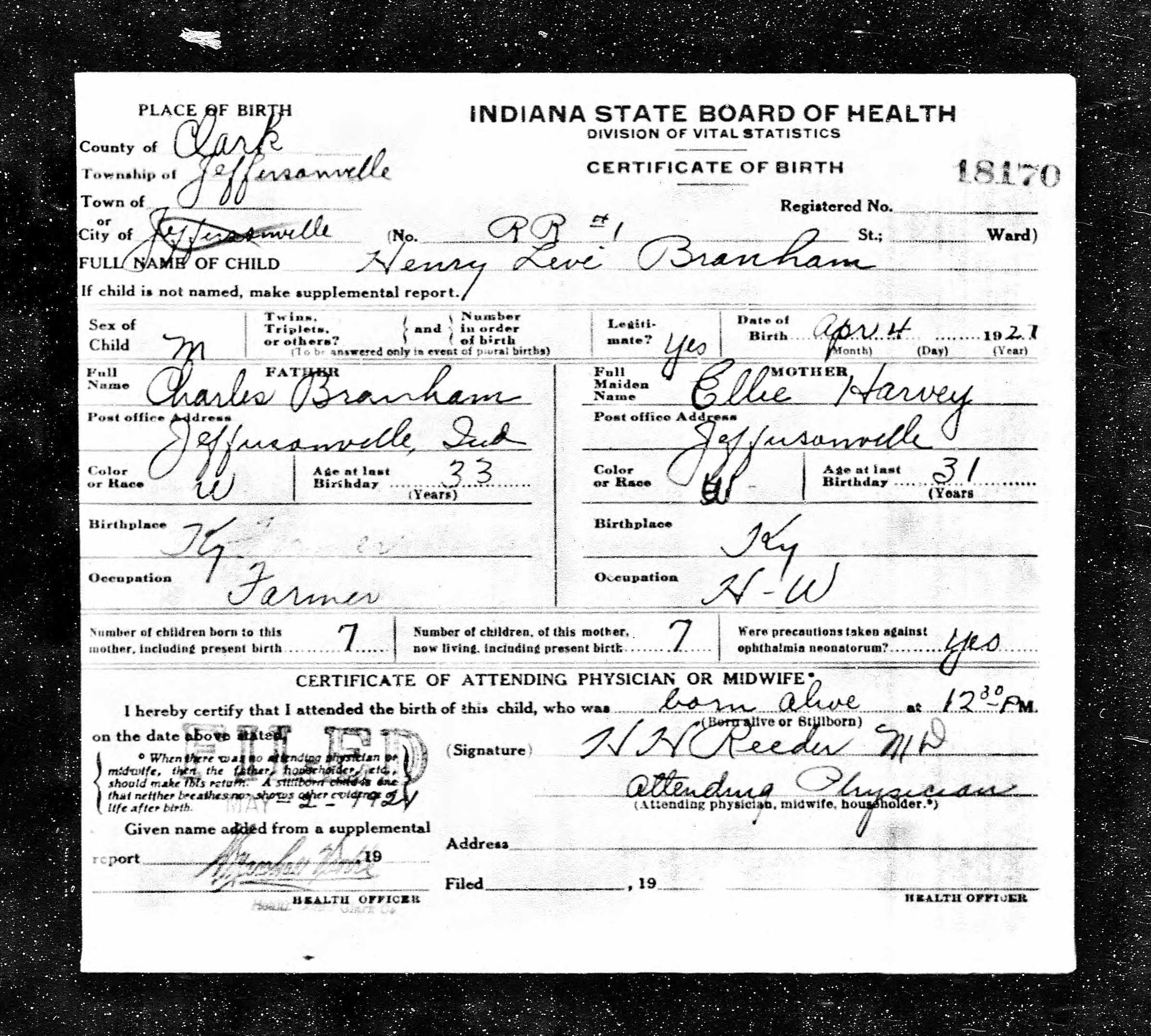 Henry, William Branham's Brother, married Leslie Davis[4] and moved to Dayton.[5] There is a strong possibility that William Branham used Henry's name since Henry was not in Jeffersonville and could not easily be contacted. According to both the United Press and local Missouri newspapers, William used the name "Henry" while touring through multiple states,[6] and people claiming to have been "healed" named "Henry" as their "healer".[7]