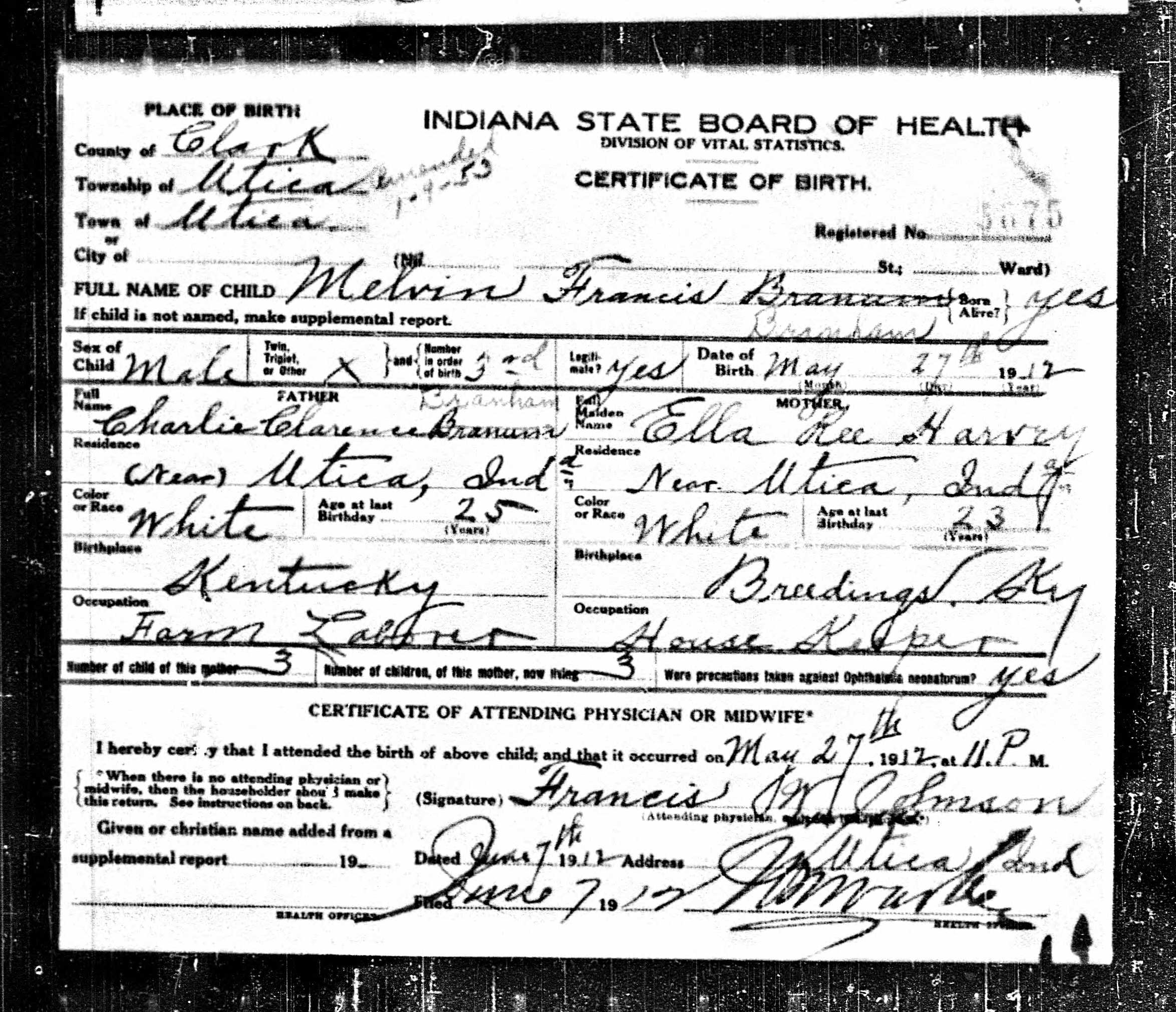 Melvin Branham was William Branham's brother. James was born after the Branham family migrated from Kentucky to Indiana, and would not have been part of the nine siblings in the log Cabin that William Branham used for his campaign literature. Melvin's birth certificate confirms that the Branham family were in Indiana as early as 1912.