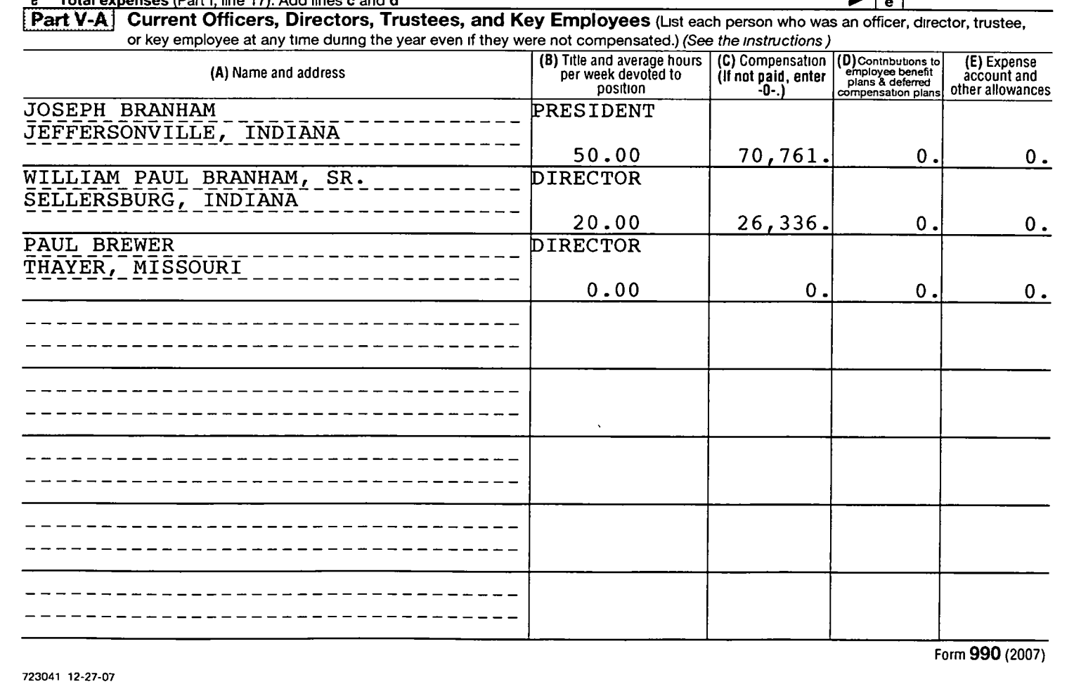 Paul Brewer is the pastor of the Evening Light Tabernacle in Thayer, MO. Brewer is named with Joseph and Billy Paul Branham as the only other Officer, Director, Trustee, or Key Employee listed on Voice of God Recordings' corporate papers. He is also listed on the corporate papers for Jehovah Jireh Foundation.