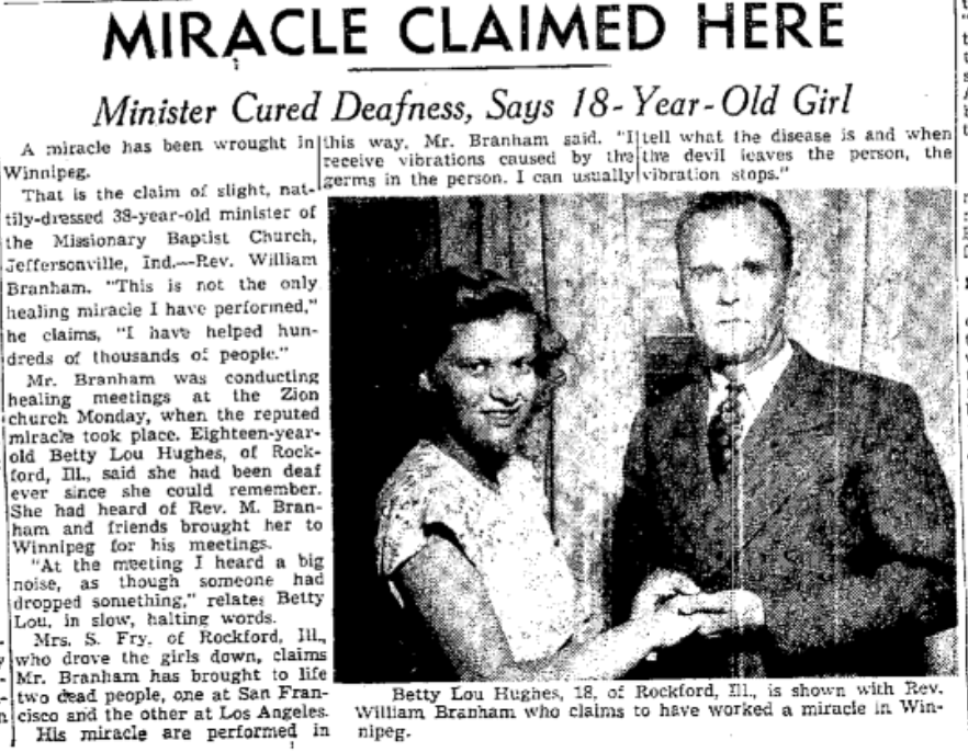In some versions of his stage persona, and just like Oral Roberts,[1] William Branham claimed to have vibrating hands[2] to "detect germs".[3] This "germ detecting vibration" was used in the late 1940s and 1950s, even on patients having diseases where germs were not involved such as cancer. Before this stage persona, however, Branham claimed to have the ability to diagnose diseases with a hand that changed color.[4] If his hand turned red or purple, the person was soon to receive their healing. If his hands remained flesh-colored, however, the person seeking healing had just made a wasted trip.
