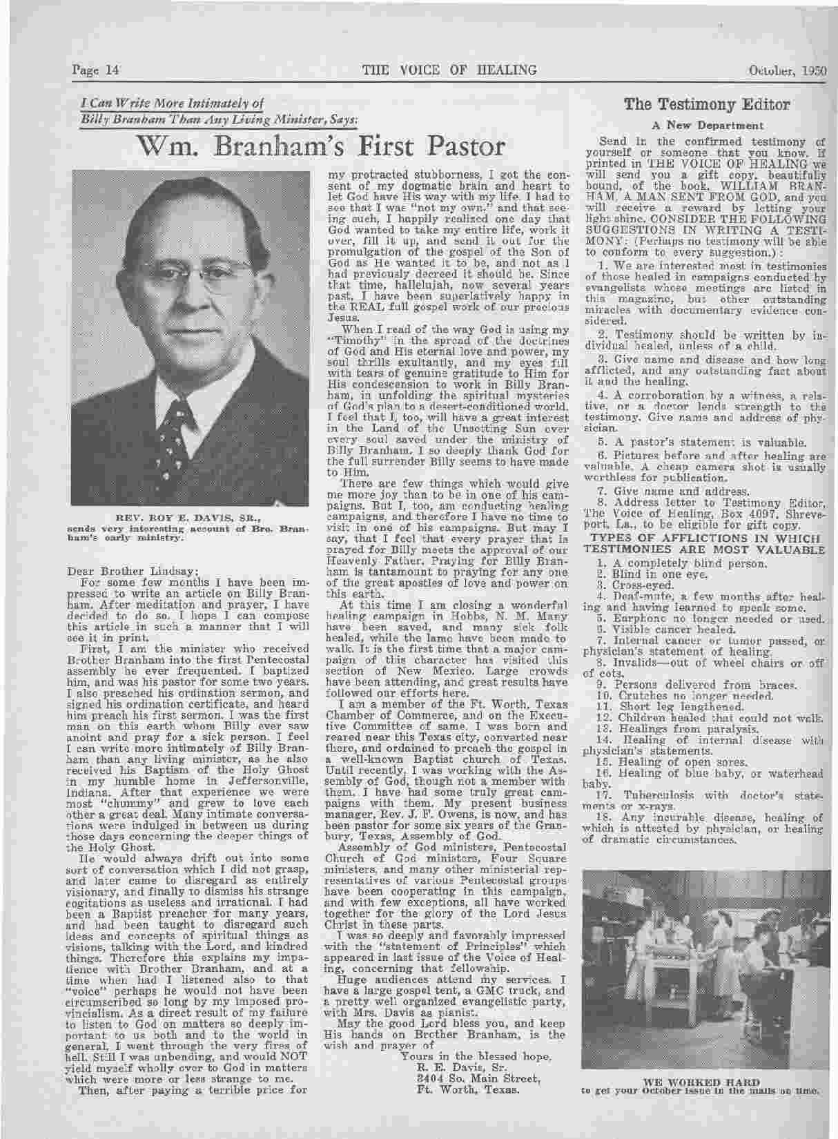 In October 1950, Roy E. Davis, William Branham's mentor and former second-in-command of the 1915 Ku Klux Klan,[1] exposed William Branham's stage persona as a fraud by publishing the correct history of his ministerial career. It was sent by letter to Gordon Lindsay and published in The Voice of Healing under the heading, "Wm. Branham's First Pastor."[2]