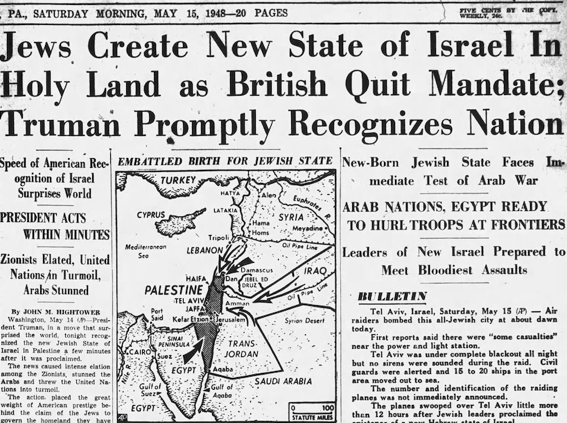 This becomes problematic when considering the history of Israel. While Branham claimed that the Nation of Israel was spiritually connected to May the 7th, 1946, the Nation of Israel was not formed until 1948.[4] In 1947, the United Nations adopted a Partition Plan for Palestine recommending the creation of independent Arab and Jewish states and an internationalized Jerusalem. The plan was accepted by the Jewish Agency and rejected by Arab leaders. The following year, the Jewish Agency declared the independence of the State of Israel, and the subsequent 1948 Arab–Israeli War finalized the establishment.