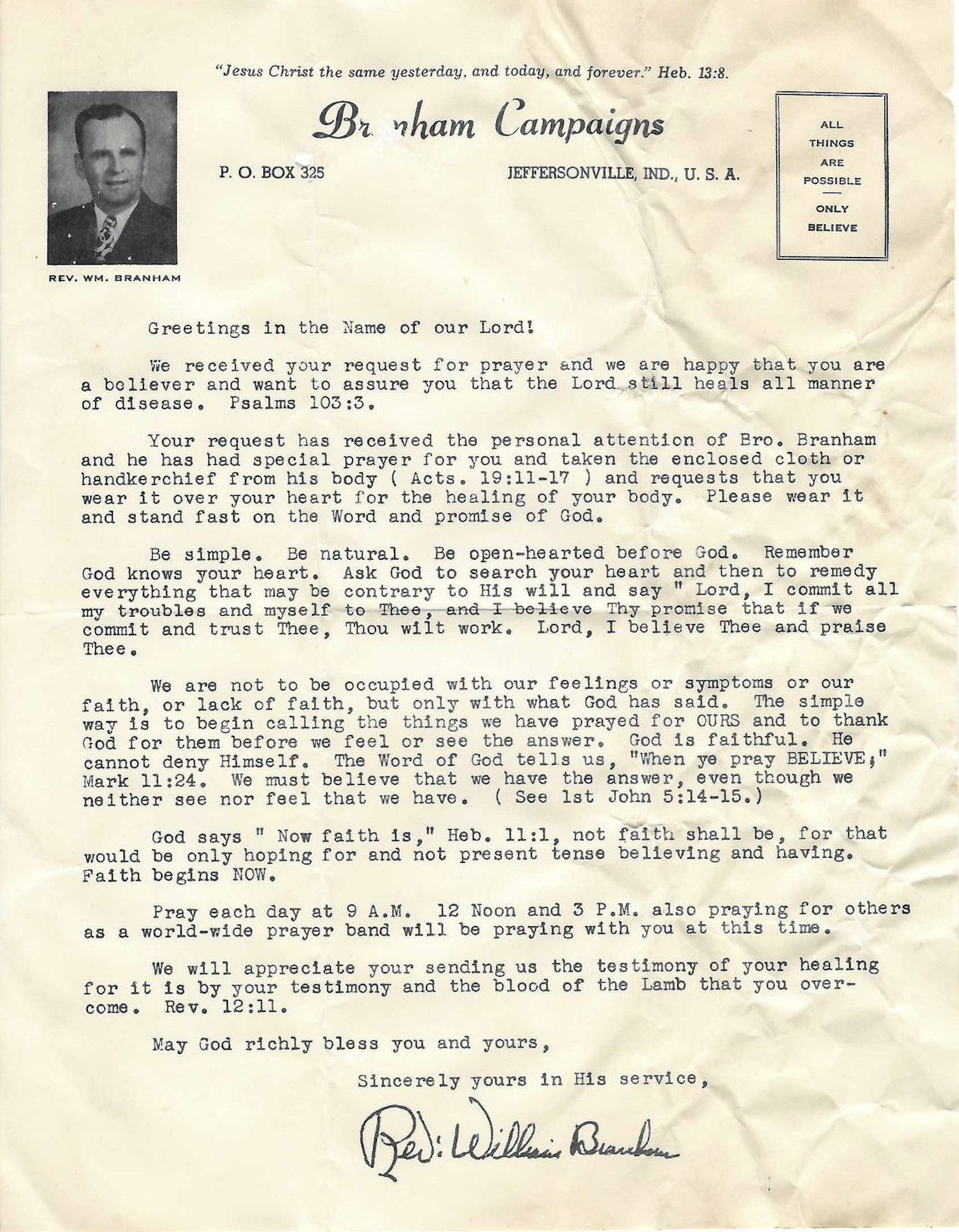 When cult followers contacted William Branham through mailed correspondence to request prayer, they received what appears to be a scripted, generic response to the request. No specific details were given. Missing from the letter were the name, the details of the request, or any "prophetic" insight into the condition or cure.