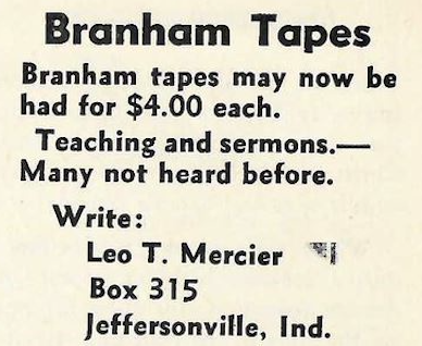 In the 1950s, Leo Mercier was the person responsible for sales and distribution of the "Message" through sales of William Branham's recordings on cassette tapes. Sermons sold for $4.00, which was unusually high compared to other forms of entertainment. Vinyl records of music, for example, sold for between $0.85 and $1.25