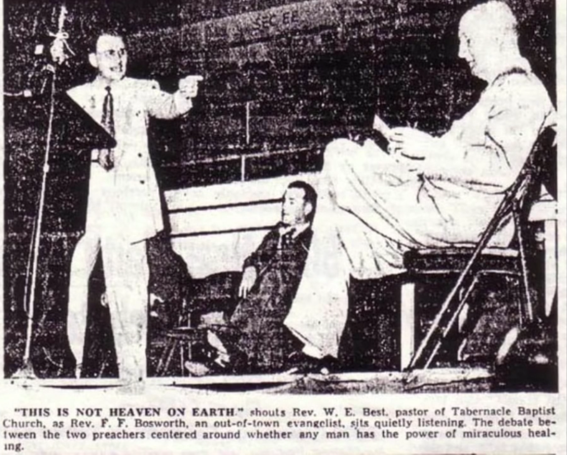 William Branham claimed that during the meeting in which his signature photo was taken in the Houston Coliseum, not a single photograph developed except for his. This, he claimed, was because God would not allow the public to view what he claimed to be disrespectful poses by Rev. Best towards Rev. F. F. Bosworth. According to Branham, the rest of the photographs were blank.