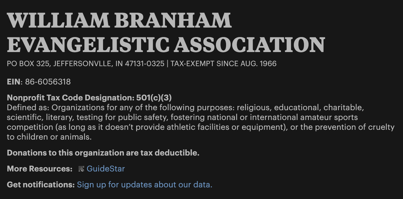 After William Branham's death, in August, 1966, a second William Branham Evangelistic Association was created in the State of Indiana. No financial data is available for the Indiana "non-profit". Since 2012, only the Arizona corporation appears to be active. As of 2018, the Arizona "non-profit" corporation had over three million dollars in assets.